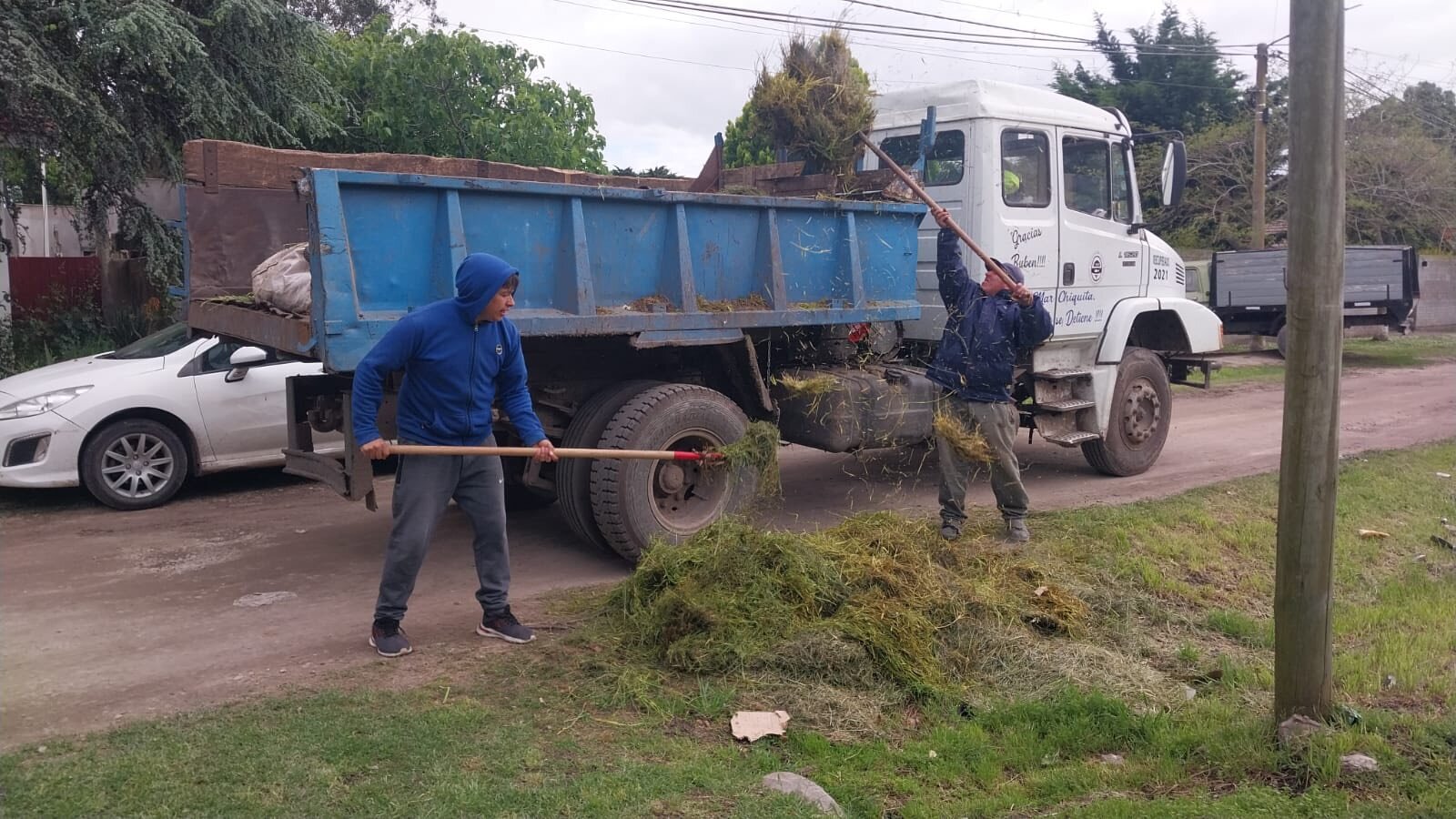 La cuadrilla municipal lleva adelante tareas de limpieza de plazas, recolección de restos de poda domiciliaria, trabajos en desagües y corte de pasto en diversos puntos del barrio.
