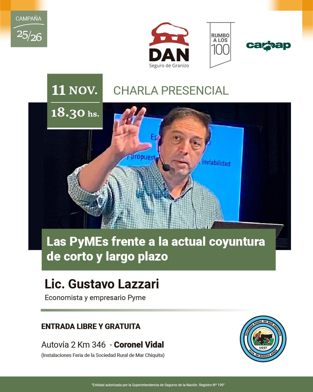 El economista y empresario Gustavo Lazzari estará este viernes 11 de noviembre en Coronel Vidal para brindar una charla presencial sobre la situación actual de las pequeñas y medianas empresas (PyMEs), en el marco de una jornada abierta al público organizada en la Sociedad Rural de Mar Chiquita.