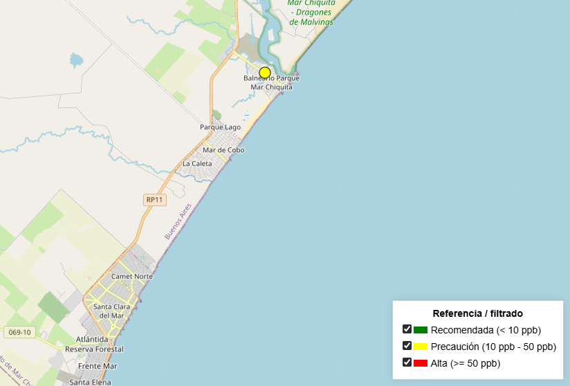 El Balneario Parque fue clasificado como “zona amarilla” por el ITBA, con valores entre 10 y 50 microgramos por litro.
