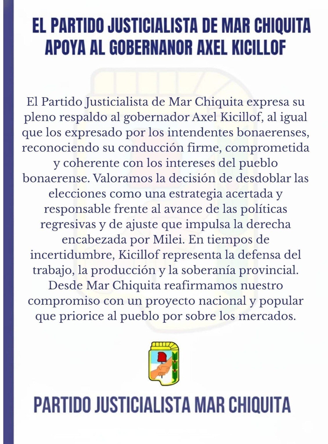 En el texto, el PJ de Mar Chiquita valoró la conducción de Kicillof como “firme, comprometida y coherente con los intereses del pueblo bonaerense”. Además, calificó como “estrategia acertada y responsable” la decisión de desdoblar las elecciones, en referencia al contexto político nacional y al avance de las políticas de ajuste impulsadas por la derecha encabezada por Javier Milei.