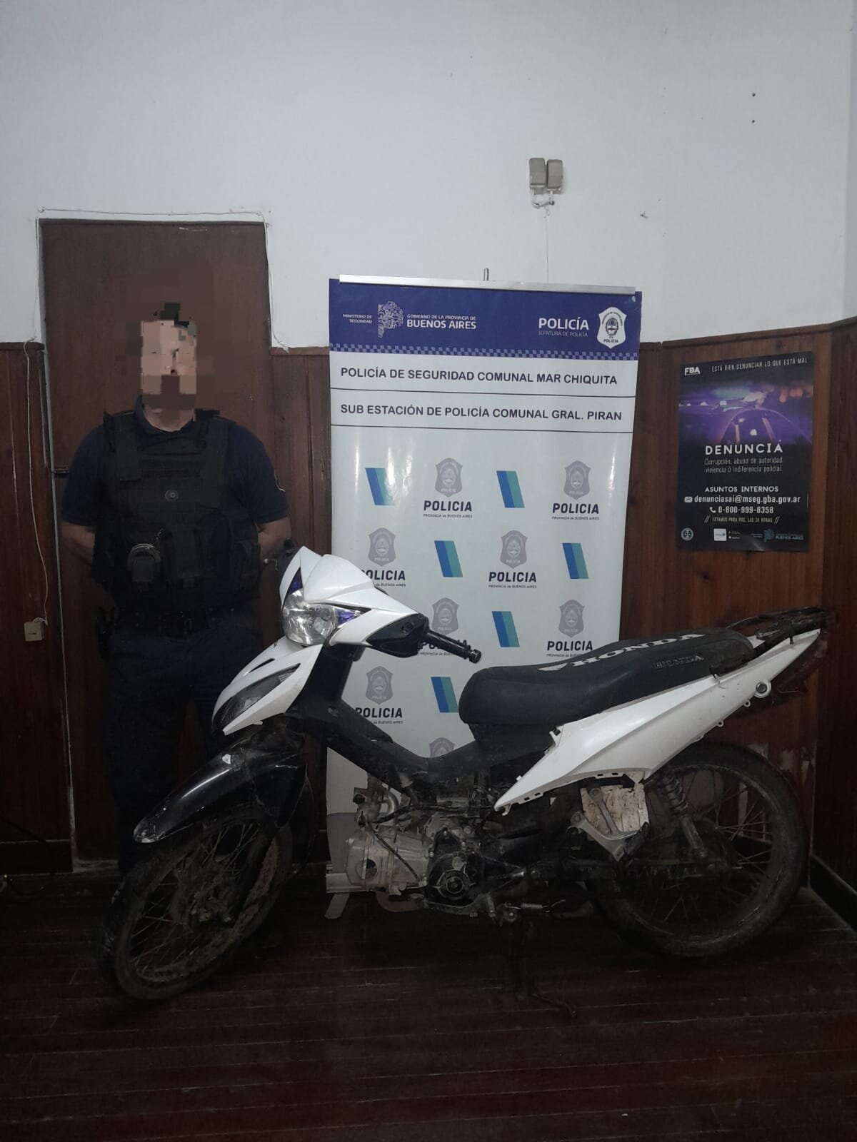 Este miércoles, personal de la Subcomisaría de General Pirán aprehendió a un joven de 20 años residente de la localidad que circulaba por la intersección de las calles Moreno y Reconquista a bordo de una moto con pedido de secuestro activo por “hurto agravado” en Mar del Plata, correspondiente al año 2024.