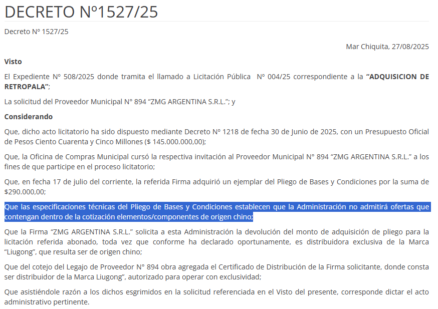 A través del Decreto Nº 1527/25 del 27 de agosto de 2025, el Municipio dispuso la devolución del costo del pliego de licitación a un proveedor que no pudo presentar oferta válida debido a una cláusula restrictiva en las bases y condiciones. El proceso correspondía a la Licitación Pública Nº 004/25, destinada a la adquisición de una retro pala, con un presupuesto oficial de ciento cuarenta y cinco millones de pesos.