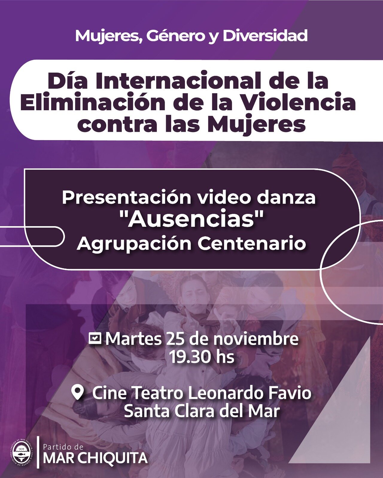 La actividad tendrá lugar el martes 25 de noviembre a las 19:30 en el Cine Teatro Leonardo Favio, con la presentación del videodanza “Ausencias” de la Agrupación Centenario. La propuesta busca visibilizar la problemática y generar un espacio de reflexión comunitaria.