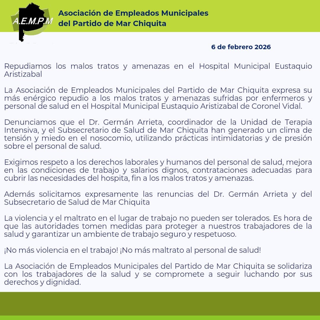 La Asociación de Empleados Municipales del Partido de Mar Chiquita que tiene a José Luis Zotta como Secretario General, emitió un comunicado donde pidió la renuncia del subsecretario de Salud, Ricardo Ludovico Gordon, y del coordinador de Terapia Intensiva del Hospital Municipal Eustaquio Aristizabal, Germán Arrieta. Desde el gremio repudiaron los “malos tratos” y “amenazas” hacia enfermeros y personal de salud.