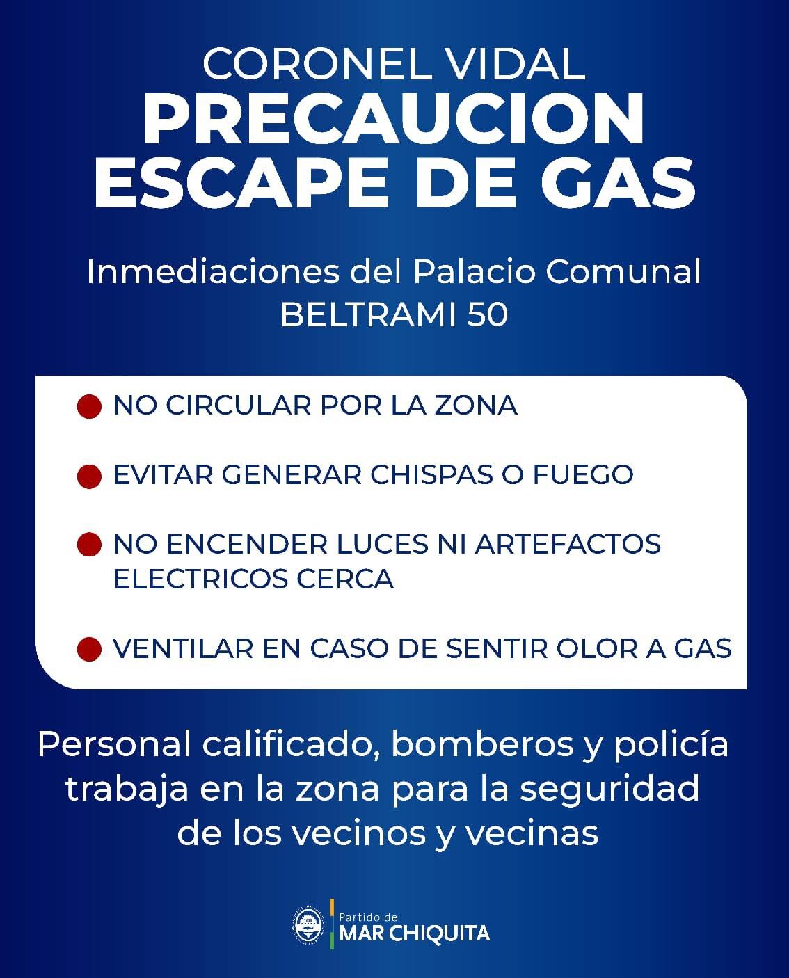 La Municipalidad de Mar Chiquita fue evacuada este jueves al mediodía por un escape de gas registrado en las inmediaciones del Palacio Comunal, en Beltrami 50, luego de que una maquinaria que operaba en la zona habría provocado la rotura de un caño, según trascendió.