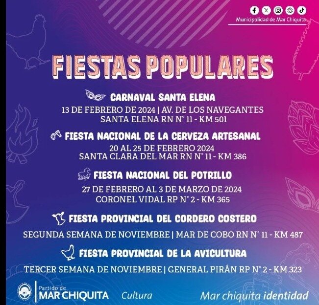 A través de las redes sociales, la comuna informó el calendario de Fiestas Populares en Mar Chiquita para el 2024 y confirmó la fecha del evento que al momento, solo tiene confirmada la fecha, aunque se estima que el epicentro estará en la Rotonda del Viejo Contrabandista.