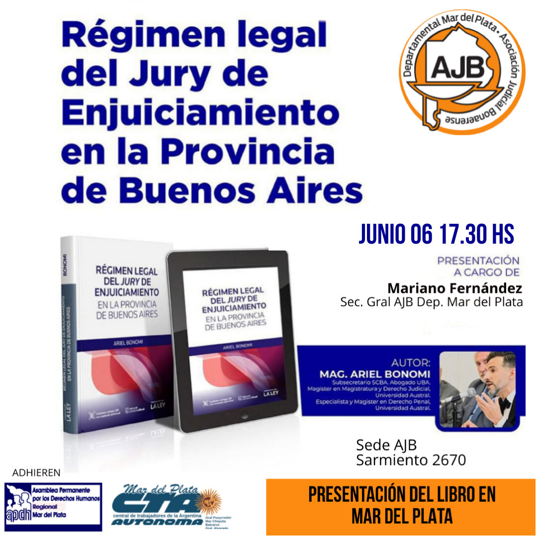 Ariel Bonomi, Subsecretario del Área Enjuiciamiento de Magistrados y Funcionarios de la Dirección de Asesoramiento Técnico de la Presidencia de la Suprema Corte de Justicia Bonaerense en Relación a los Organismos de la Constitución, presentará su libro “Régimen legal del Jury de Enjuiciamiento en la Provincia de Buenos Aires” en el cual aborda aspectos vinculados a la reseñada temática.