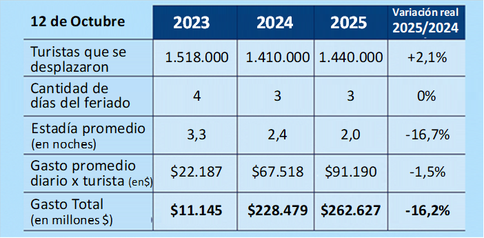 Durante el fin de semana largo del 12 de octubre, más de 1.440.000 turistas se desplazaron por todo el país, según informó la Confederación Argentina de la Mediana Empresa (CAME) a través de un comunicado oficial. La cifra representa un incremento del 2,1% respecto al mismo feriado de 2024, impulsado por el buen clima, las reservas de último momento y la cercanía del verano.