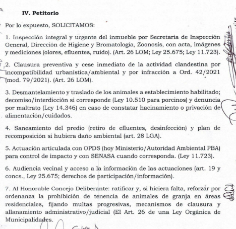 Los vecinos pidieron una inspección integral del inmueble, con actas y evaluación técnica sobre olores, efluentes y ruidos, y solicitaron la clausura preventiva del lugar. También reclamaron el traslado de los animales a un establecimiento habilitado, el saneamiento del predio y la articulación con autoridades ambientales provinciales.