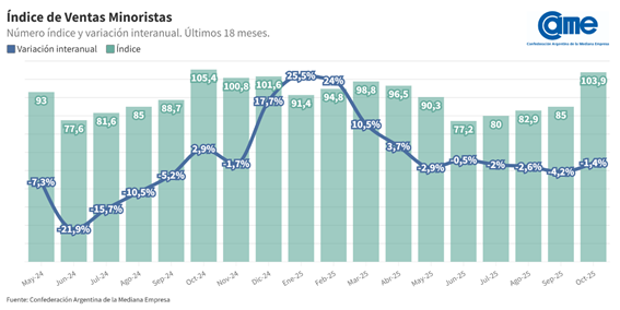 La Confederación Argentina de la Mediana Empresa (CAME) informó que en octubre las ventas minoristas pymes registraron una variación interanual de -1,4% a precios constantes. En la comparación mensual desestacionalizada, se observó un incremento de 2,8%, mientras que en lo que va del año las ventas acumulan un aumento interanual de 4,2%.