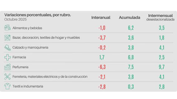 En el análisis por rubros, seis de los siete sectores relevados mostraron caídas interanuales. El rubro “Perfumería” presentó la mayor baja con -6,3%, seguido por “Bazar, decoración, textiles para el hogar y muebles” con -3,7%.