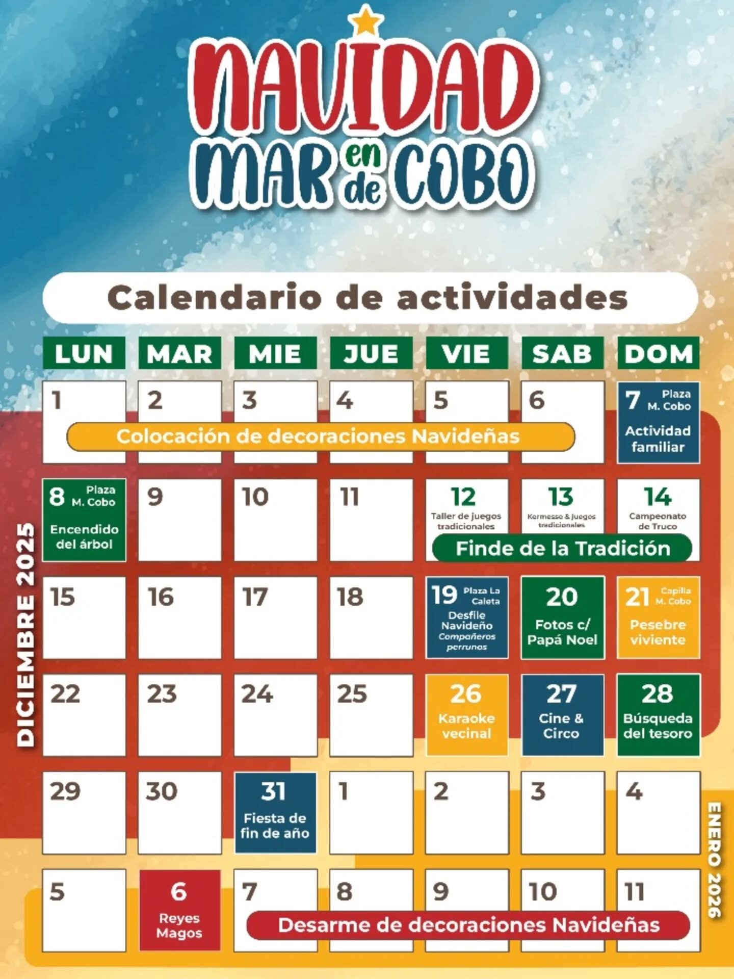 La programación iniciará el 5 de diciembre y se extenderá hasta el 6 de enero de 2026. Habrá actividades de jueves a domingo en la plaza central, el parador turístico y comercios de la zona que se sumarán a la iniciativa. El cronograma incluye el encendido del árbol navideño, talleres de juegos tradicionales, kermesse, campeonato de truco, desfile con mascotas, pesebre viviente, karaoke vecinal, cine, circo, búsqueda del tesoro y fiesta de fin de año.