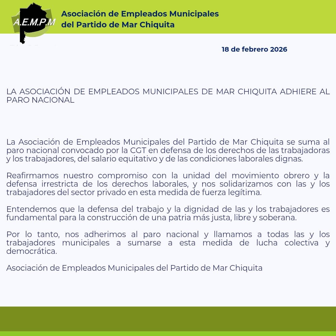 La Asociación de Empleados Municipales del Partido de Mar Chiquita anunció su adhesión al paro nacional convocado por la Confederación General del Trabajo en defensa de los derechos de las trabajadoras y los trabajadores. La entidad comunicó que la medida busca respaldar el salario equitativo y las condiciones laborales dignas en el marco del reclamo impulsado por la central obrera.