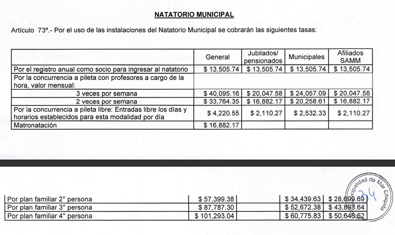 Según la Ordenanza Fiscal Impositiva aprobada por el Concejo Deliberante de Mar Chiquita a finales del año pasado, el costo es de $13.505,74 para todas las categorías. La concurrencia con profesores tendrá un valor mensual de $40.095,16 tres veces por semana y $33.764,35 dos veces por semana en la categoría general.