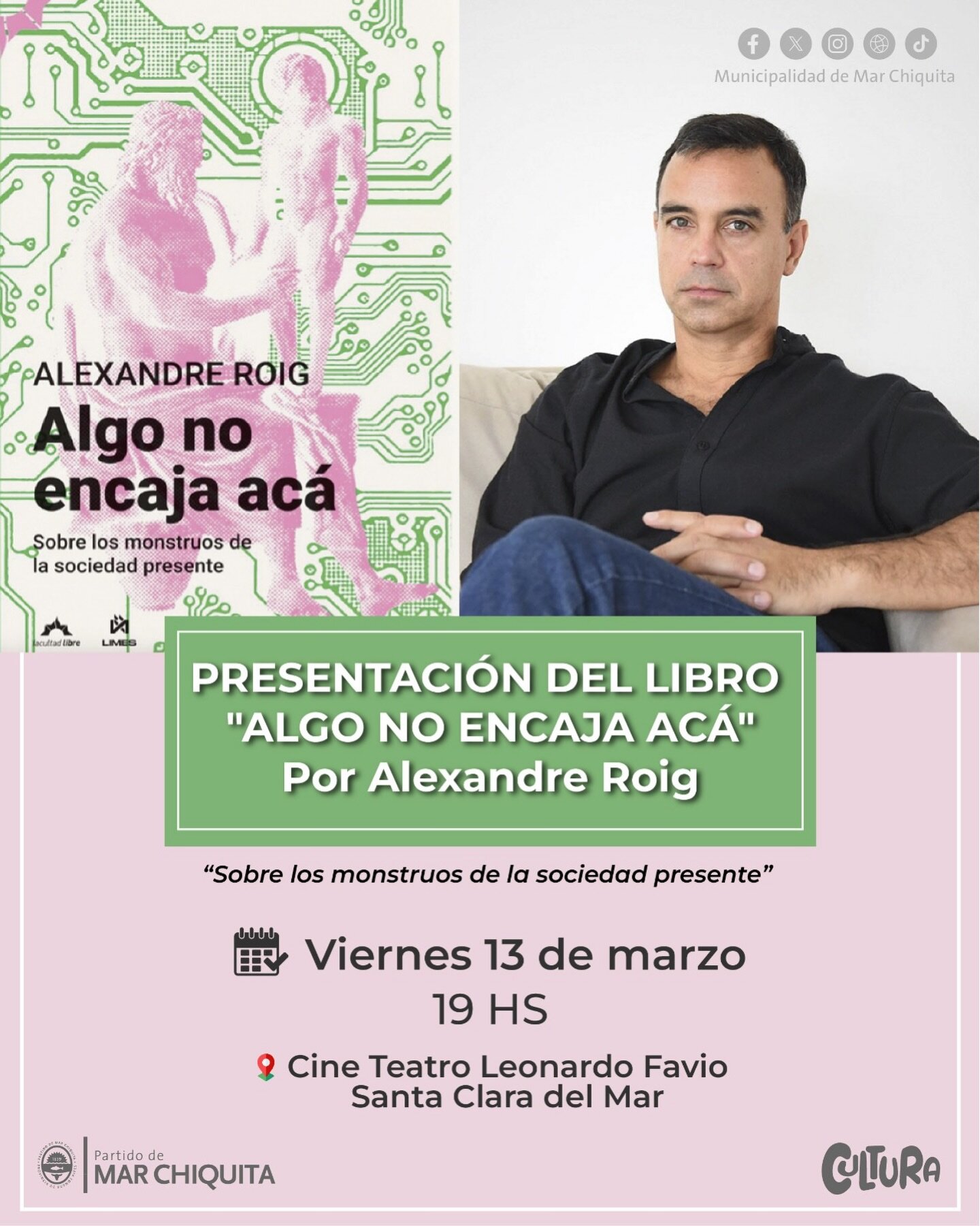 La Secretaría de Cultura de la Municipalidad de Mar Chiquita anunció que el viernes 13 de marzo a las 19 se realizará la presentación del libro “Algo no encaja acá” de Alexandre Roig en el Cine Teatro Leonardo Favio de Santa Clara del Mar.