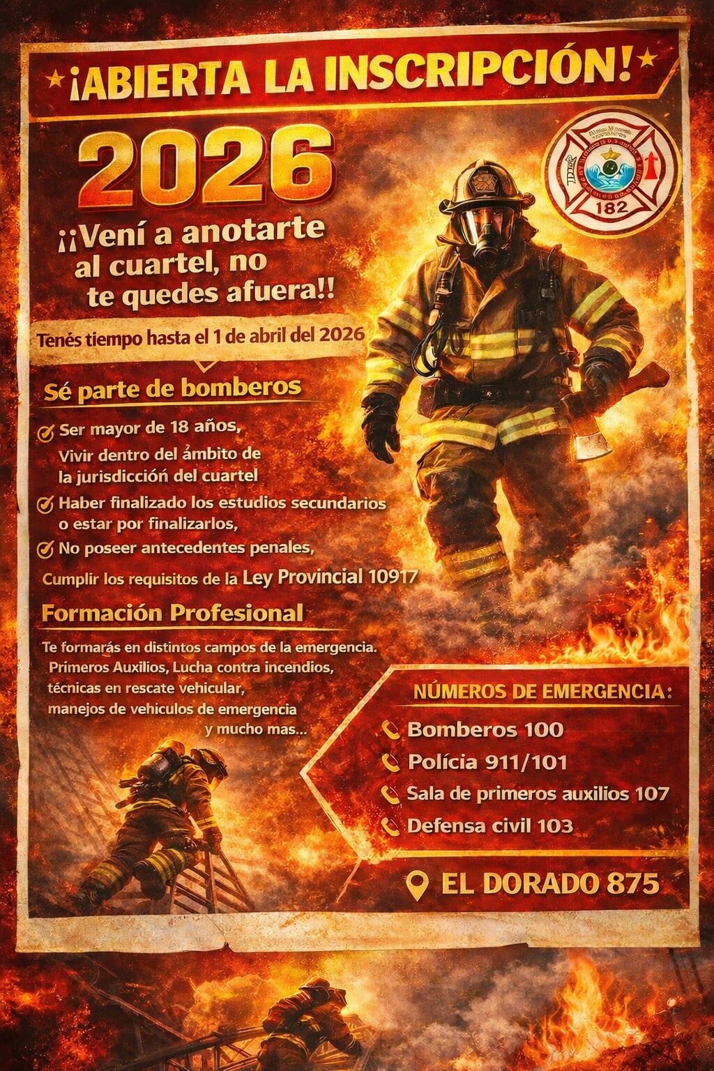 La convocatoria está dirigida a mayores de 18 años que residan dentro de la jurisdicción del cuartel, hayan finalizado o estén por finalizar los estudios secundarios, no posean antecedentes penales y cumplan los requisitos establecidos por la Ley Provincial 10.917. Desde la institución destacaron que la formación profesional incluye primeros auxilios, lucha contra incendios, técnicas de rescate vehicular, manejo de vehículos de emergencia y otras áreas vinculadas a la atención de emergencias.